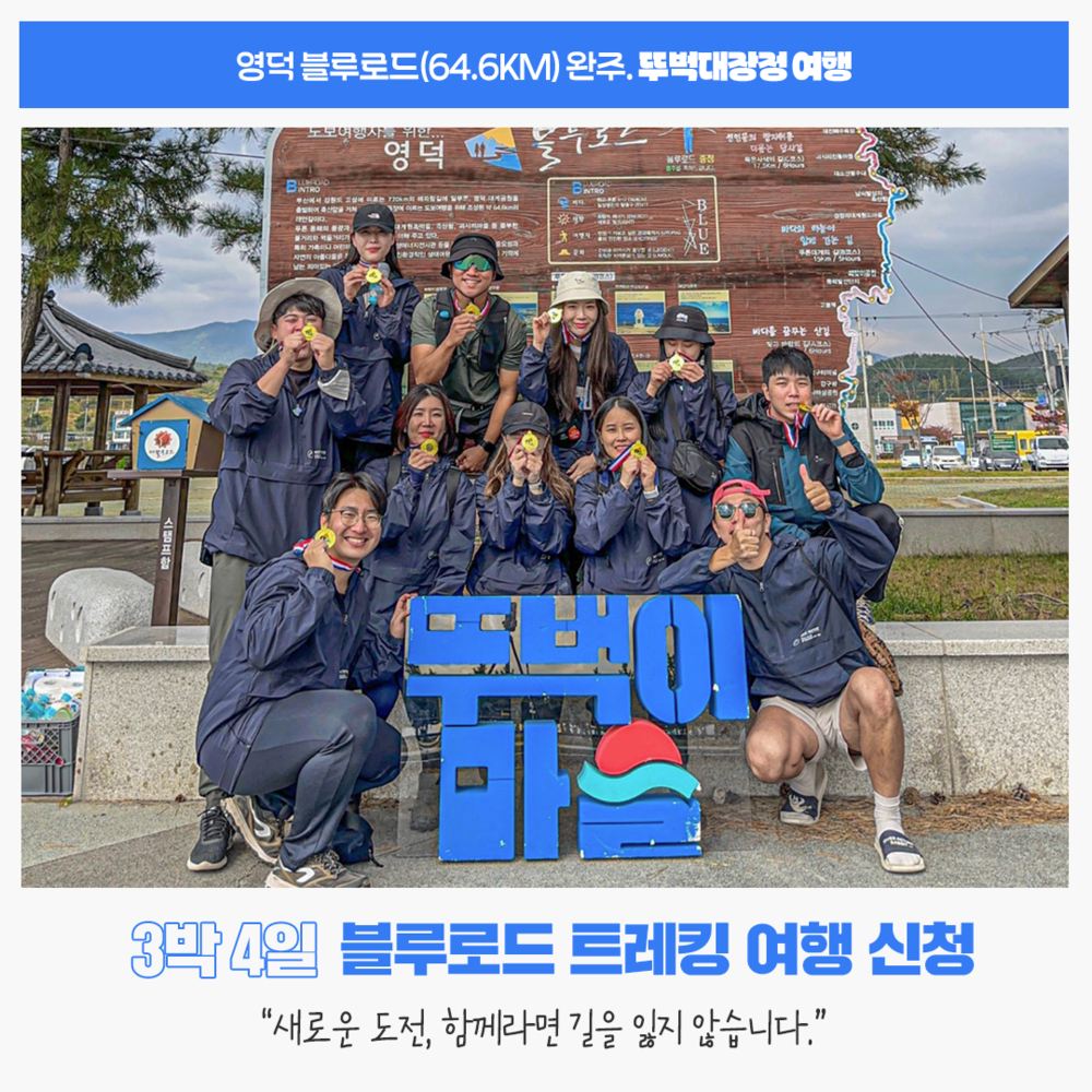 💡블루로드란? : 빼어난 절경과 함께 푸른 동해바다의 내음을 느끼며 걷는 트레킹 코스로 부산에서 강원도 고성에 이르는 해파랑길의 일부 코스입니다. 영덕 대게공원을 출발하여 축산항을 거쳐 고래불해수욕장에 이르는 도보여행을 위해 조성된 64.6km의 해안 길입니다.